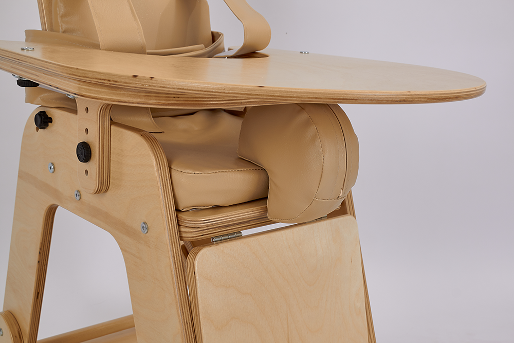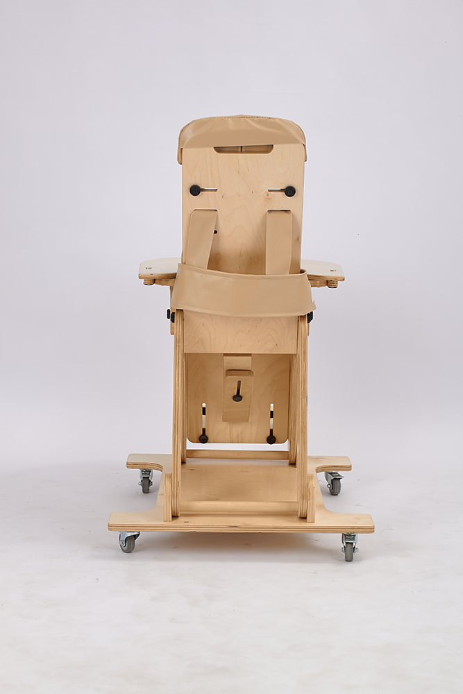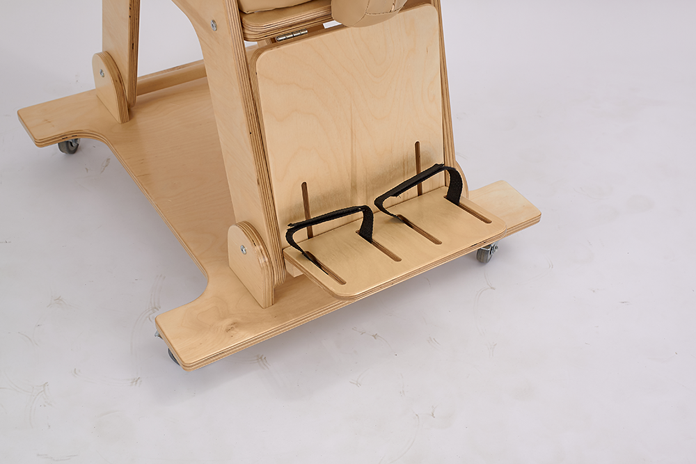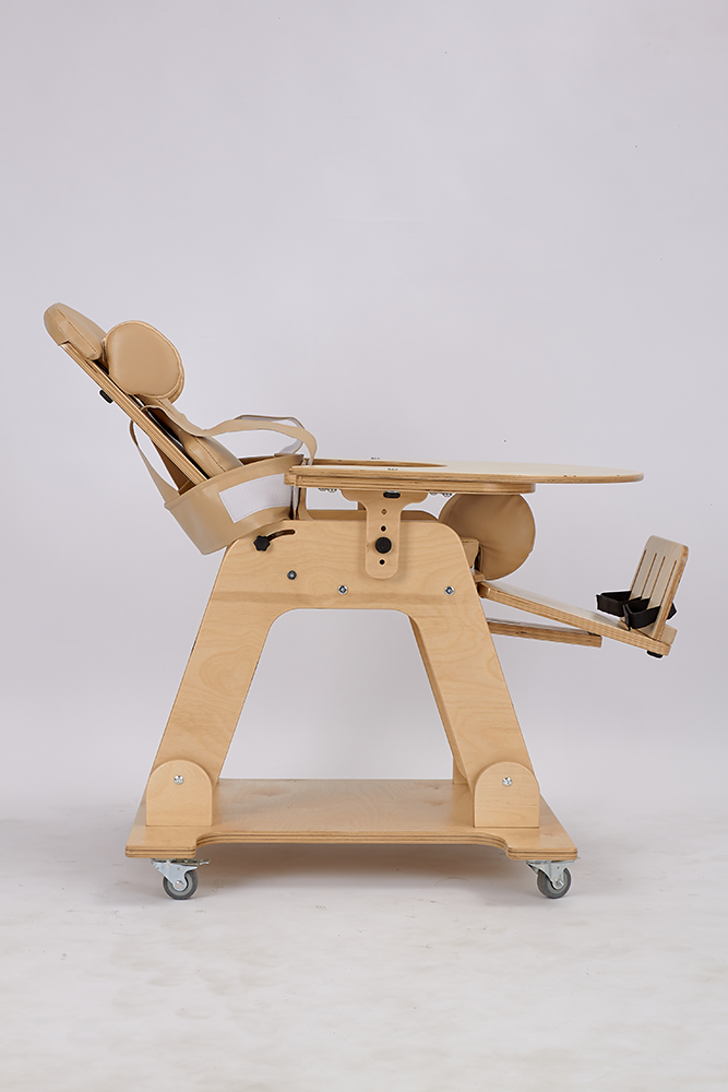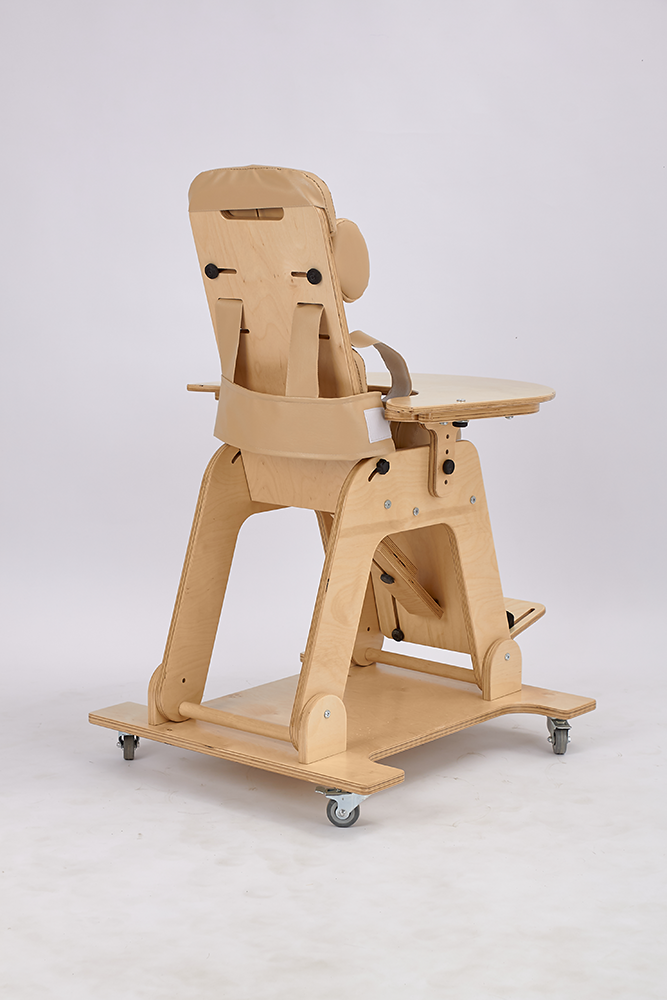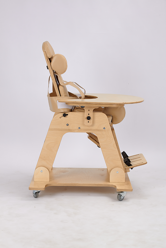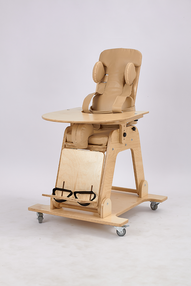 Опора оснащена подлокотниками, абдуктором и фиксаторами головы, а также текстильными элементами для фиксации и мягкое регулируемое сидение. Углы всех элементов опоры закруглены, обеспечивая безопасность эксплуатации опоры. Подлокотники регулируются по высоте в зависимости от особенностей ребенка. Столешница также подвижна для удобства в эксплуатации.